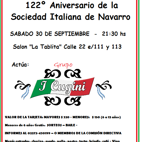 122º ANIVERSARIO DE LA SOCIEDAD ITALIANA SABADO 30 DE SEPTIEMBRE 21:30 HORAS – LA TABLITA CON LA ACTUACIÓN DE Grupo...